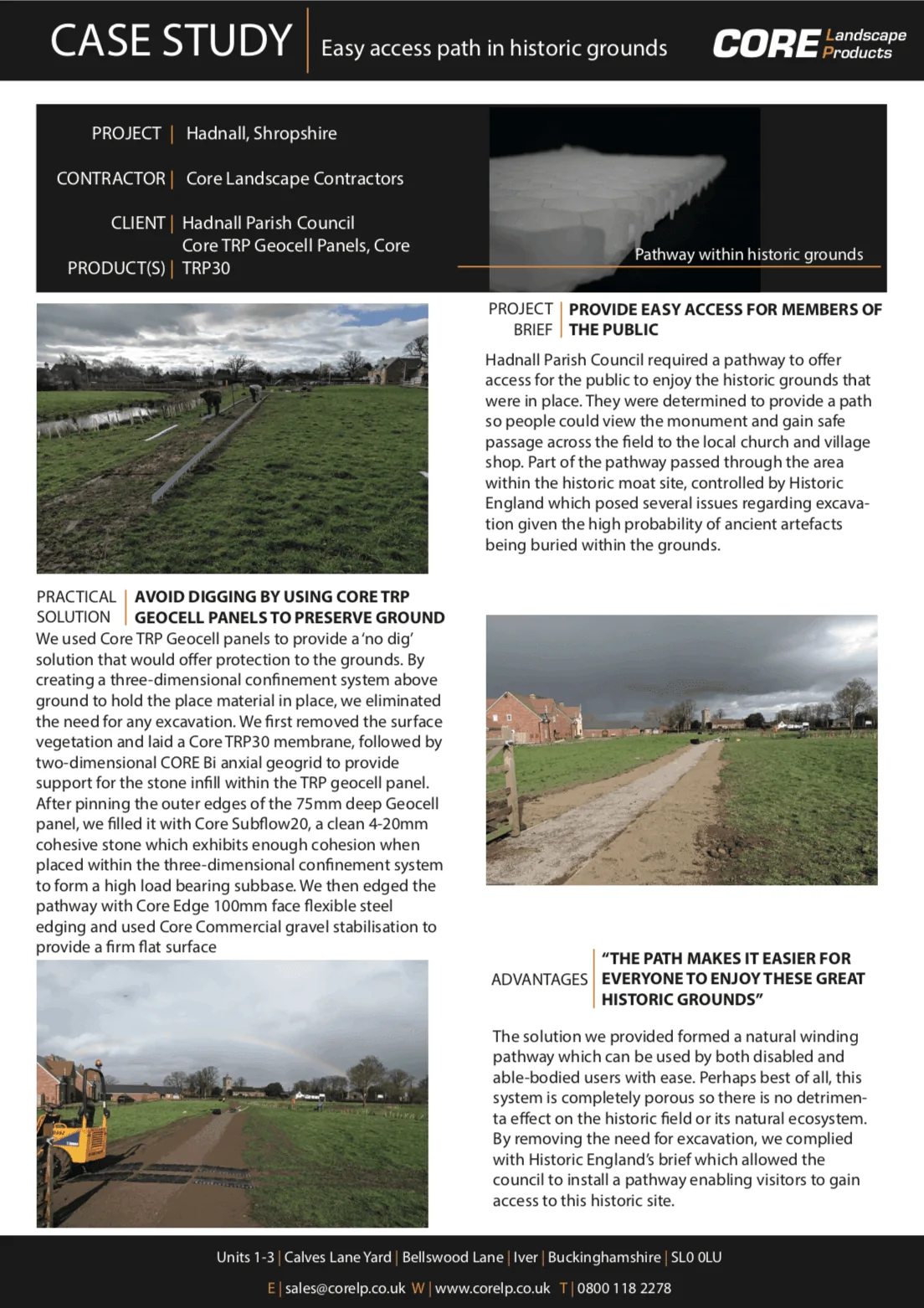 We used CORE TRP Geocell panels to provide a ‘no dig’ solution that would offer protection to the grounds. By creating a three-dimensional confinement system above ground to hold the base material in place, we eliminated the requirement for any excavation. We first removed the surface vegetation and laid a CORE TRP30 membrane, followed by a two-dimensional CORE Bi axial geogrid to provide support for the stone infill within the TRP geocell panel. After pinning the outer edges of the 75mm deep Geocell panel, we filled it with CORE Subflow20, a clean 4-20mm cohesive stone which exhibits enough cohesion when placed within the three-dimensional confinement system to form a high load bearing subbase. We then edged the pathway with CORE Edge 100mm face flexible steel edging and used CORE Commercial gravel stabilisation to provide a firm flat surface.