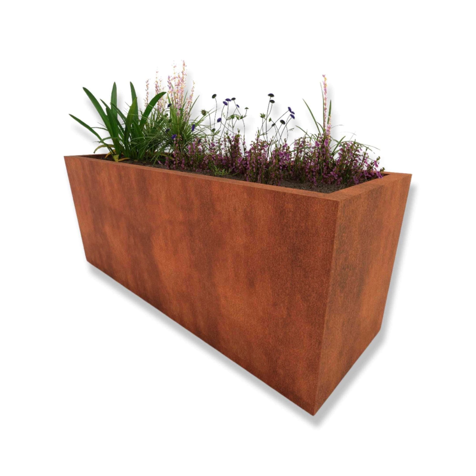 All of our planters are made from 100% genuine, certified Corten steel. We make our rectangular Corten steel planters with feet from structural grade, 2mm thick steel as standard. Corten steel develops a unique and distinct patina when exposed to the elements. The patina is beautiful and protective. Any custom sizes can be produced in up to 6mm steel depending on the intended use.